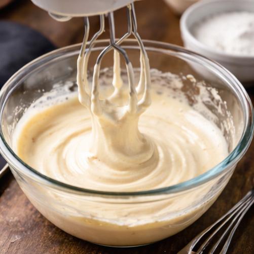 Yumurtalar ve şeker yaklaşık 2–3 dakika çırpılmalıdır.